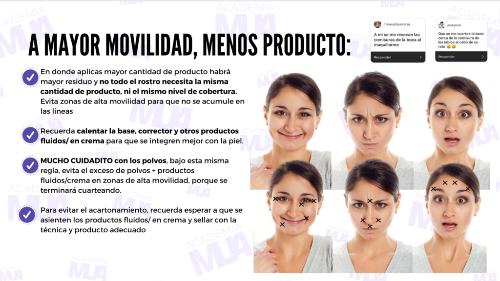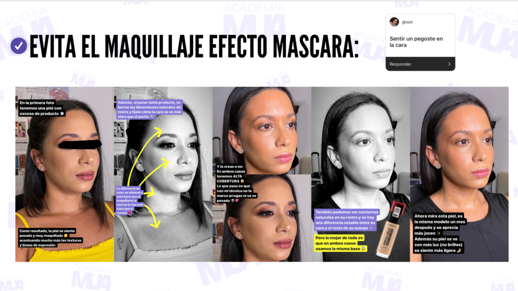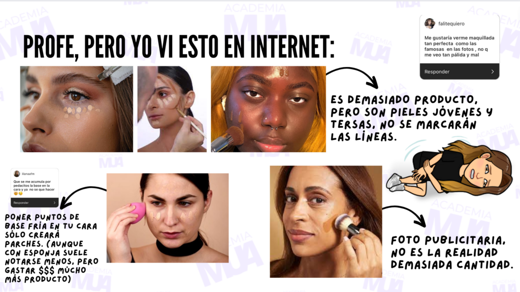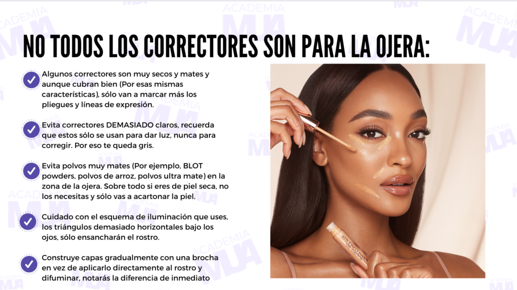 Estos son los errores que más cometen las personas al maquillarse. Como te comenté antes, nuestra piel con el paso de los años cambia y hay truco para que se vea mucho mejor. Y no, no son los trucos que solemos ver en los videos virales de internet. Estos son mis mejores consejos y trucos para que la piel se vea como piel y no como una mascara, para que no te quede apelmazado o cuarteado el corrector en la ojera. Estos ejercicios y tips los verás muchísimo en nuestras aplicaciones practicas de maquillaje.
